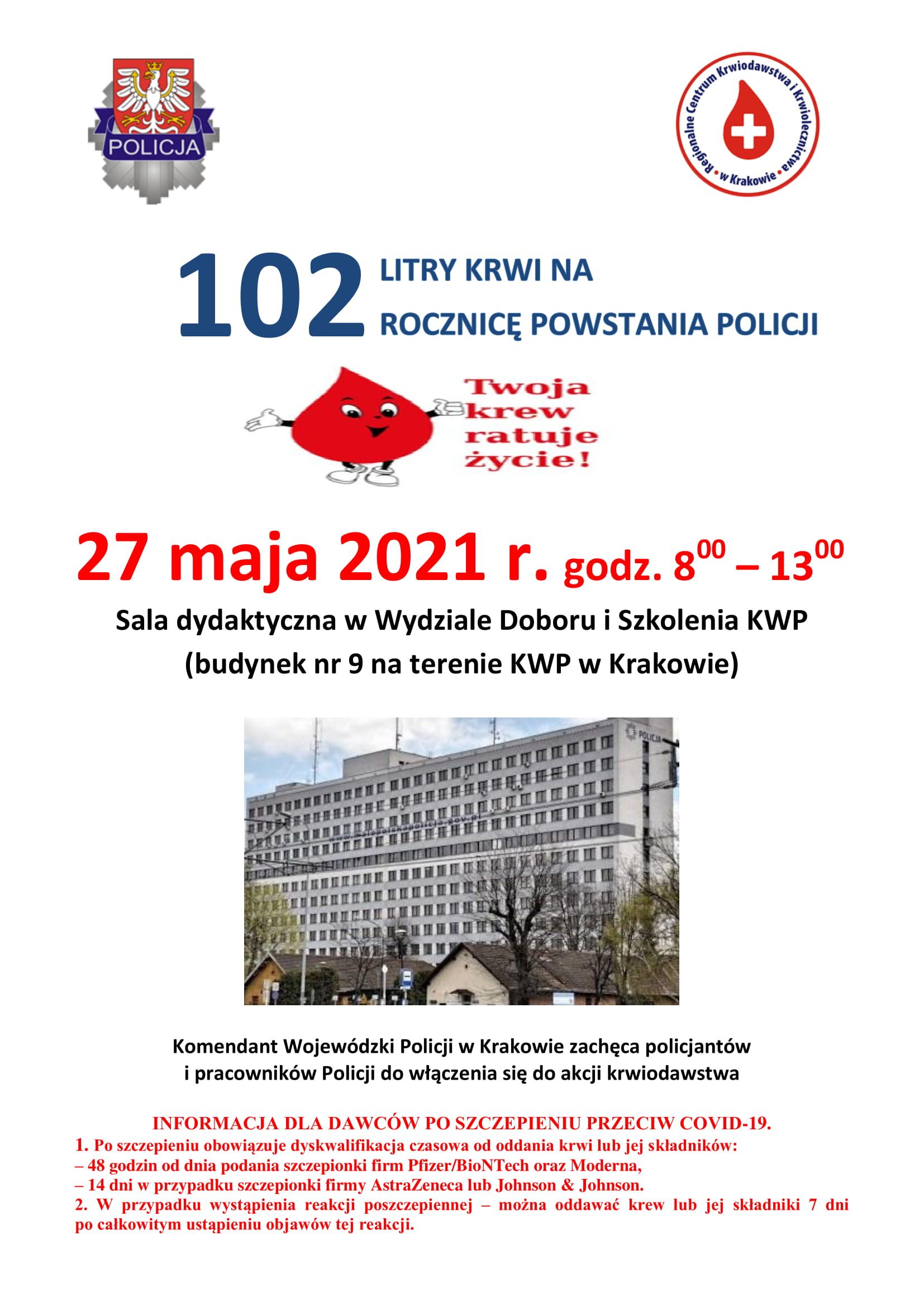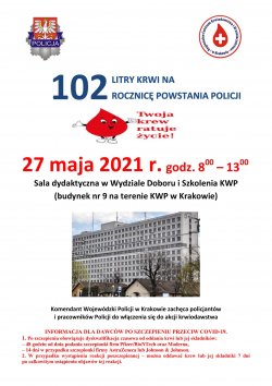 27 maja od godziny 8:00 do 13:00 na terenie Komendy Wojewódzkiej Policji w Krakowie w budynku nr 9, sala 1 (Wydział Doboru i Szkolenia KWP w Krakowie) odbędzie się kolejna zbiórka krwi w ramach akcji „102 litry krwi na 102 rocznicę powstania Policji”.