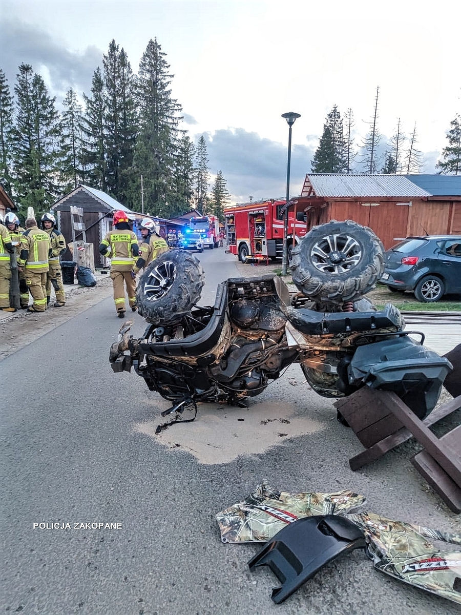 We wtorek wieczorem tj. 14 czerwca br. około godziny 20:00 do tatrzańskiej policji wpłynęło zgłoszenie o wypadku drogowym z udziałem quada na Gubałówce. Z przekazanych informacji wynikało, że osoba kierująca quadem z nieznanych przyczyn zjechała nagle z drogi uderzając w drewnianą konstrukcję znajdującą się w pobliżu krawędzi jezdni. W efekcie zderzenia pojazd przewrócił się, a dwie osoby nim jadące upadając na jednię doznały poważnych obrażeń ciała. Bardzo szybko na miejscu wypadku pojawiły się służby ratunkowe, które przystąpiły do udzielania pomocy poszkodowanym. Poważnie ranni osiemnastolatkowie z powiatu tatrzańskiego zostali przetransportowani do szpitali w Nowym Targu i w Zakopanem. Po pewnym czasie zaczęły docierać pierwsze informacje o ich stanie zdrowia. Wprawdzie doznali licznych złamań i obrażeń wewnętrznych, ale na szczęście ich życiu obecnie nie zagraża niebezpieczeństwo. Poszkodowanym tj. mężczyźnie i kobiecie pobrano krew do dalszych badań.