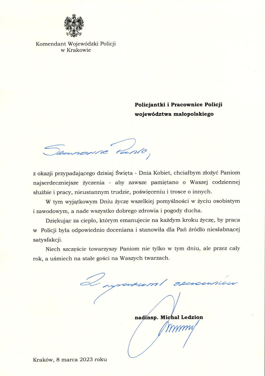 ŻYCZENIA KOMENDANTA WOJEWÓDZKIEGO POLICJI W KRAKOWIE Z OKAZJI ŚWIĘTA KOBIET Powrót Drukuj Komendant Wojewódzki Policji w Krakowie nadinsp. Michał Ledzion składa policjantkom oraz pracownicom cywilnym życzenia z okazji Dnia Kobiet