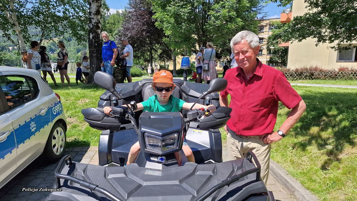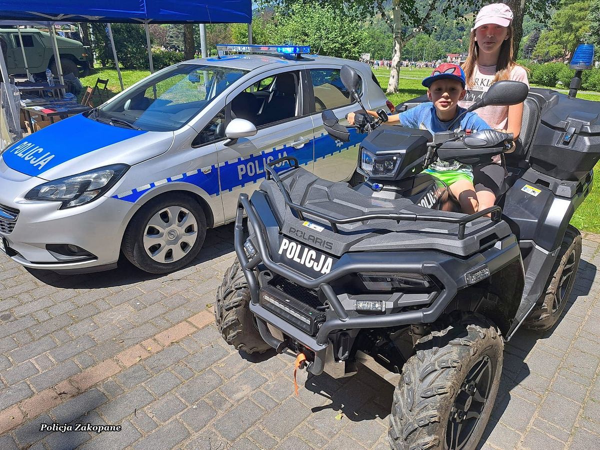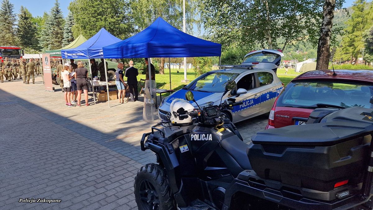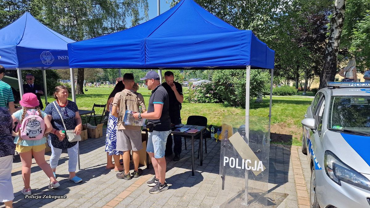 Policjanci przygotowali stanowisko z policyjnym wyposażeniem wykorzystywanym przez mundurowych w czasie służb, a także radiowóz, motocykl i pojazd typu quad, na które każde z dzieci mogło usiąść i włączyć sygnały świetlne i dźwiękowe. Dzieci i dorośli całymi grupami przychodzili do policjantów, aby porozmawiać na temat bezpieczeństwa oraz poznać specyfikę służby. Była to świetna okazja do przypomnienia zasad bezpieczeństwa podczas wypoczynku nad wodą i w górach podczas wakacji. Wśród odwiedzających policyjne stoisko było również wielu dorosłych i seniorów, którym przypomniano jak ważnym jest zabezpieczenie własnego domu na czas wakacyjnych wyjazdów. Przy okazji rozdawano ulotki o możliwych oszustwach np. metodą na wnuczka. Dla młodzieży odwiedzającej policjantów przygotowaliśmy ulotki informacyjne o rekrutacji do służby w policji. Było wiele pytań o możliwość pełnienia służby pod Tatrami. Cieszymy się, że mieliśmy tak wielu miłych gości na naszym stanowisku, którzy chętnie robili sobie pamiątkowe zdjęcia i zadawali wiele istotnych pytań na temat bezpieczeństwa.