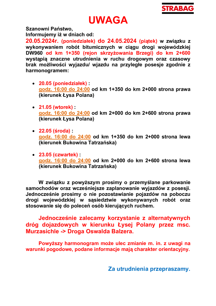 KOMUNIKAT: „Od 20.05.2024 (poniedziałek) do 24.05.2024 (piątek) w związku z wykonywaniem robót bitumicznych w ciągu drogi wojewódzkiej DW960 od km 1+350 (rejon skrzyżowania Brzegi) do km 2+600 wystąpią znaczne utrudnienia w ruchu drogowym oraz czasowy brak możliwości wyjazdu/wjazdu na przyległe posesje”.