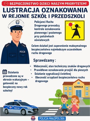 Lustracja dróg w rejonach placówek oświatowych to jedno z pierwszych działań policyjnych przed rozpoczęciem roku szkolnego. Po pierwszym dzwonku małopolscy policjanci będą prowadzić wzmożone działania „Bezpieczna droga do szkoły”, w ramach których będą czuwać nad bezpieczeństwem dzieci i młodzieży. W rejonach szkół będą prowadzić nadzór i kontrolę prawidłowego zachowania na drodze poszczególnych uczestników ruchu drogowego natomiast w szkołach przeprowadzą działalność profilaktyczno – edukacyjną.
