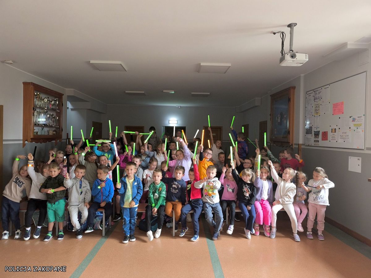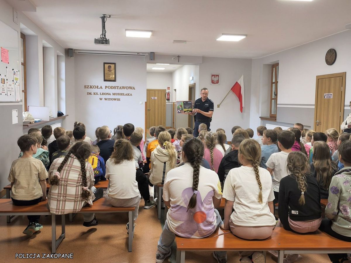 W związku z rozpoczętym nowym rokiem szkolnym zakopiańscy policjanci kontynuują spotkania profilaktyczne z uczniami podhalańskich szkół, podczas których w zależności od wieku odbiorców oraz potrzeb zgłaszanych przez szkoły, poruszana jest problematyka dotykająca bezpieczeństwa w codziennym funkcjonowaniu, odpowiedzialności prawnej nieletnich czy też zagadnień związanych z zagrożeniem cyberprzemocą. Ostatnio odwiedziliśmy m.in. Szkołę Podstawową w Witowie, gdzie spotkaliśmy się z uczniami klas od I do VIII informując, edukując i ostrzegając. Najmłodsi uczestnicy naszych spotkań otrzymali opaski odblaskowe poprawiające bezpieczeństwo podczas poruszania się po drogach. Dziękujemy dyrekcji, nauczycielom i uczniom. Mamy nadzieję, że nasze wspólne wysiłki przyczynią się do poprawy bezpieczeństwa.
