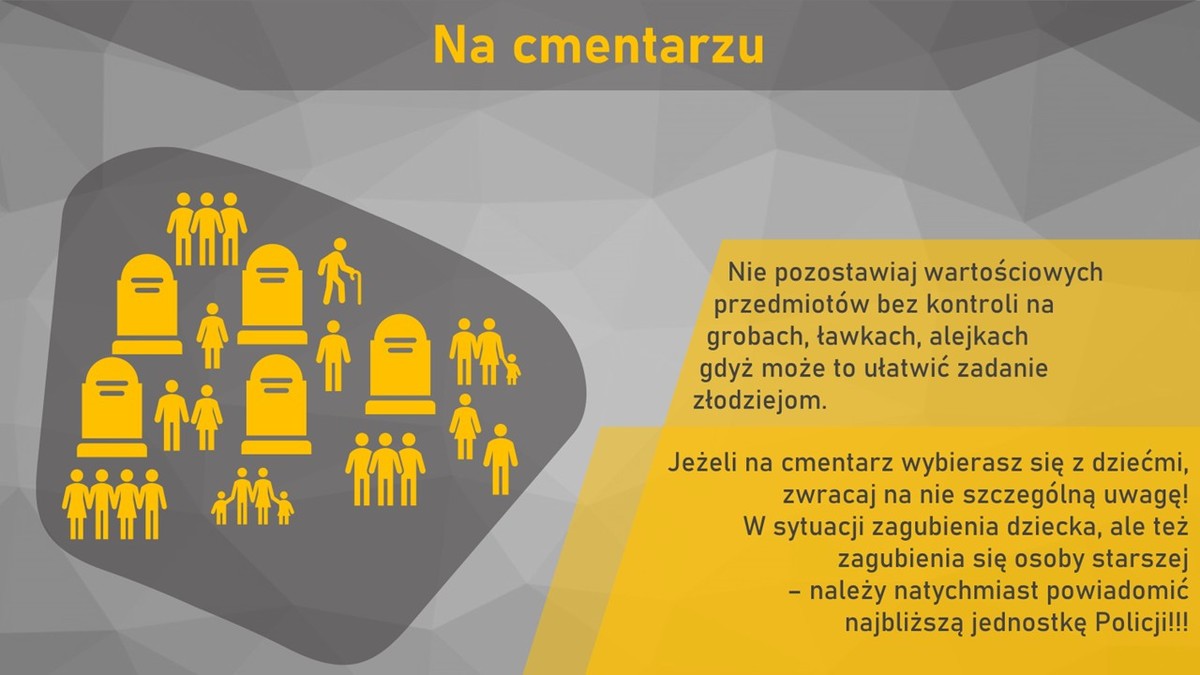 1 i 2 listopada to czas kiedy rodziny odwiedzają groby swoich bliskich. Zapoznaj się z poradami Wydziału Prewencji KWP Kraków dotyczącymi zabezpieczenia domu przed ewentualnym włamaniem, bezpiecznej podróży komunikacją zbiorową czy samochodem i środkach ostrożności na cmentarzu.