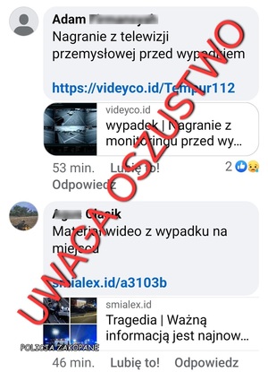 Ponownie w ostatnim czasie zauważamy, że pod postami związanymi ze zdarzeniami drogowymi pojawiają się komentarze z różnych fałszywych kont dotyczących posiadania rzekomego nagrania z wypadku. I zdarza się niestety, że wrodzona ciekawość wygrywa i ktoś postanowi spróbować obejrzeć to nagranie. Jest to niebezpieczny link, który może zainfekować Wasze urządzenie, a dodatkowo przejąć dane logowań z Waszych przeglądarek. W efekcie dochodzi do przejęcia kont na Facebooku, a później z przejętego konta rozsyłane są różne nieprawdziwe wiadomości zazwyczaj te o podanie kodu blik lub dokonanie przelewów.