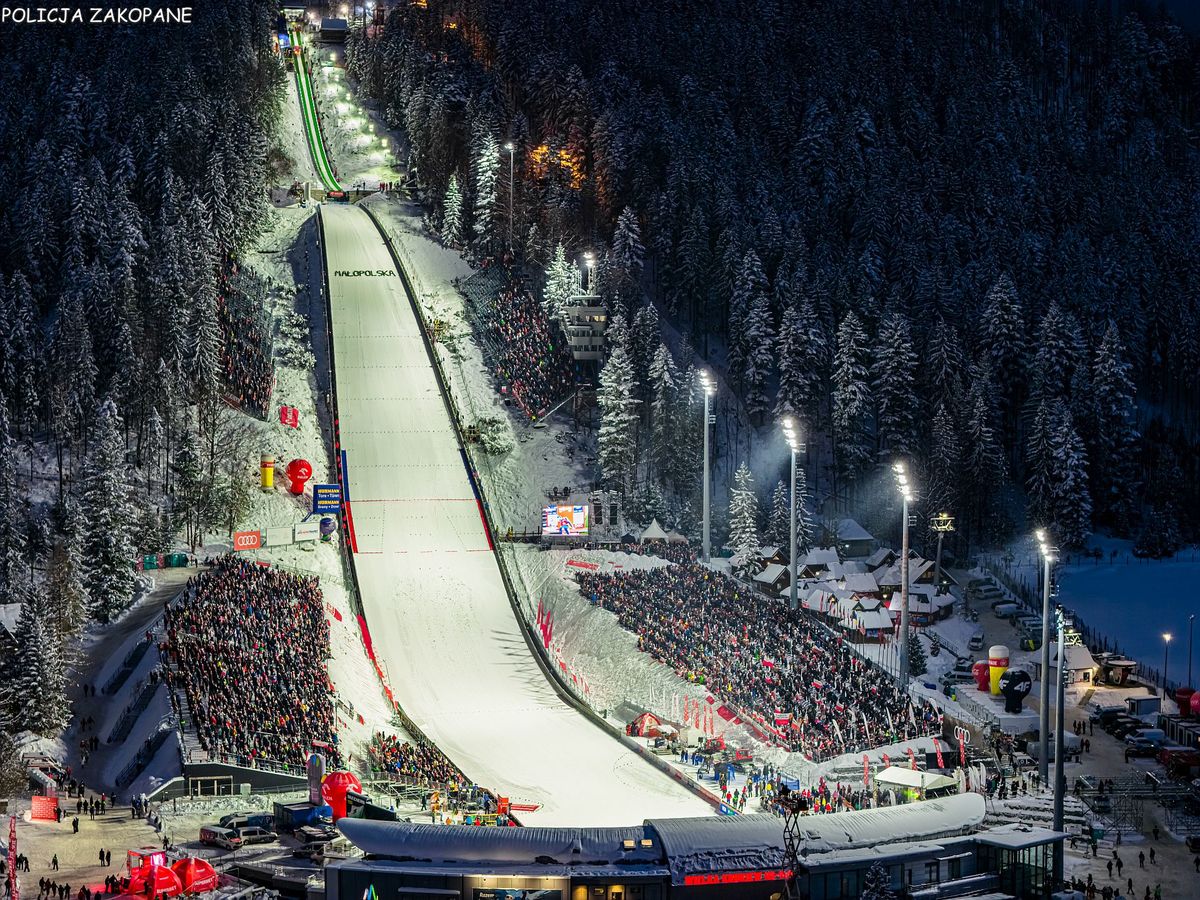 Blisko 200 małopolskich policjantów pełni służbę w powiecie tatrzańskim w ten wyjątkowy weekend ze skokami narciarskimi. Tysiące kibiców dopingowało zawodnikom startującym na rozbiegu na Wielkiej Krokwi. Policjanci dbali o porządek w rejonie rozgrywania zawodów jak również dbali o bezpieczny przebieg fety po zakończeniu rywalizacji sportowej.
