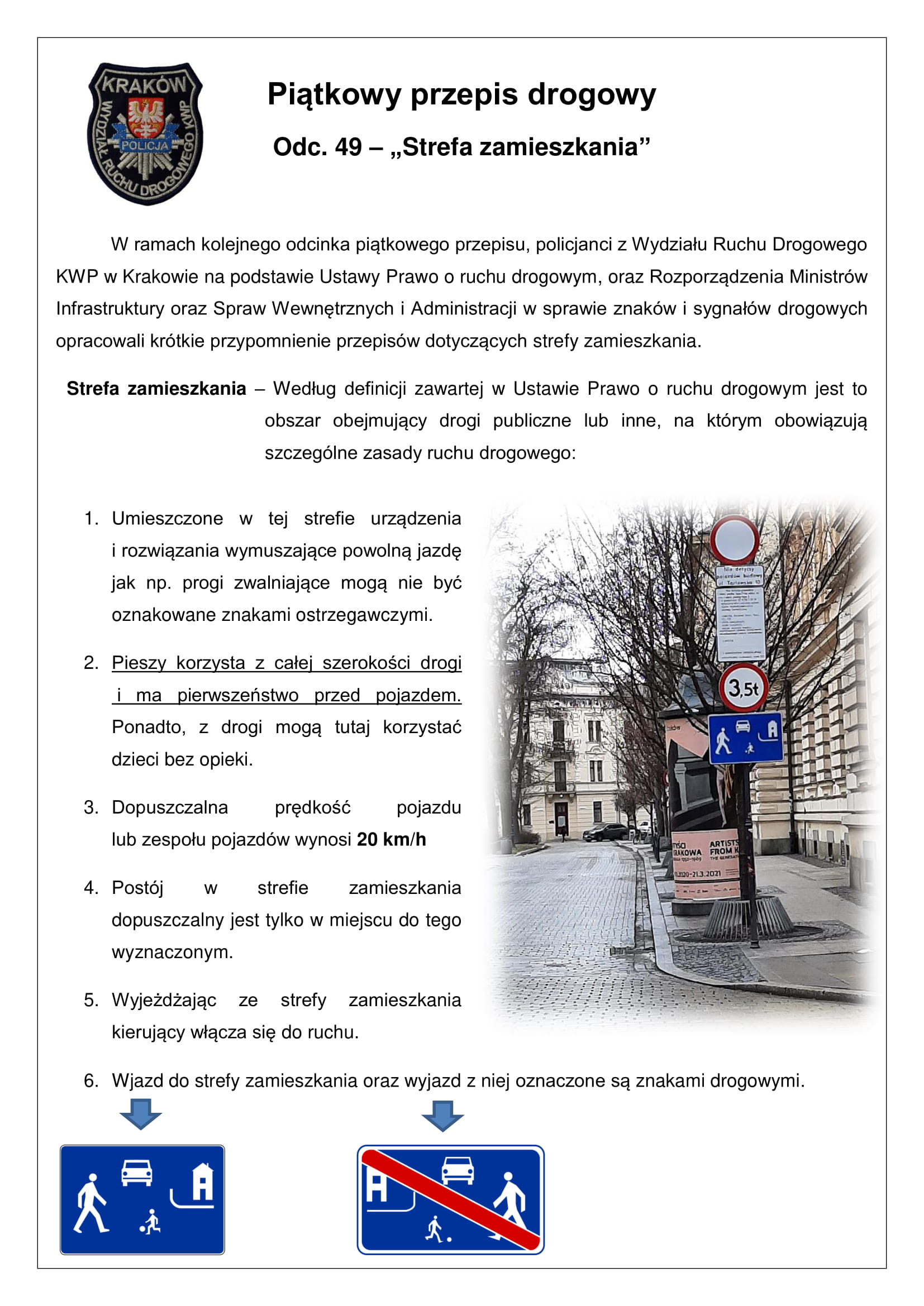 W ramach kolejnego odcinka piątkowego przepisu, policjanci z Wydziału Ruchu Drogowego KWP w Krakowie na podstawie Ustawy Prawo o ruchu drogowym, oraz Rozporządzenia Ministrów Infrastruktury oraz Spraw Wewnętrznych i Administracji w sprawie znaków i sygnałów drogowych opracowali krótkie przypomnienie przepisów dotyczących strefy zamieszkania.