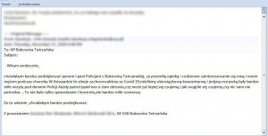 Kilka dni temu otrzymaliśmy wiadomość e-mail od mieszkańców gminy Bukowina Tatrzańska. Jej treść publikujemy poniżej. W imieniu policjantów z Komisariatu Policji w Bukowinie Tatrzańskiej, dziękujemy za każde dobre słowo w uznaniu dla naszej codziennej służby.